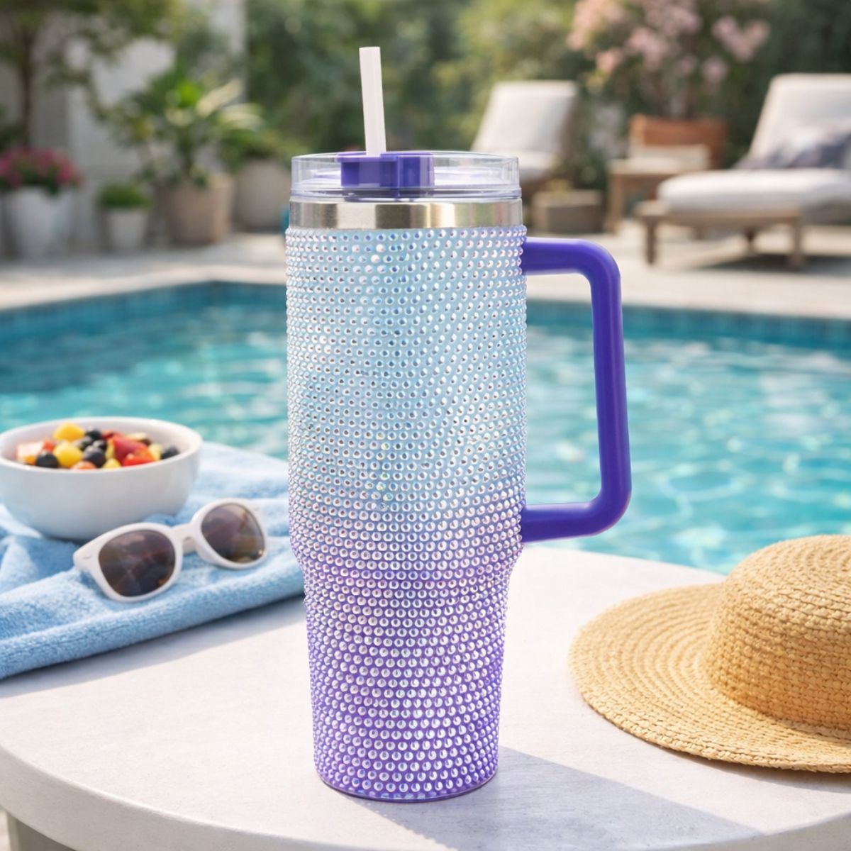 Ο Θερμός Ποτήρι Ταξιδιού με Χερούλι & Καλαμάκι Μωβ Ιριδίζον Στρας είναι η ιδανική επιλογή για όσους θέλουν να απολαμβάνουν τα αγαπημένα τους ροφήματα παντού, με στυλ και άνεση. Κατασκευασμένο από ανοξείδωτο ατσάλι SUS 304, προσφέρει ανθεκτικότητα, υγιεινή χρήση και εξαιρετική διατήρηση θερμοκρασίας.
