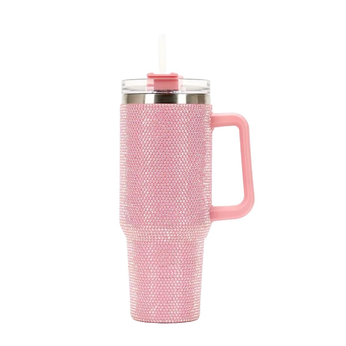 Θερμός Ποτήρι Ταξιδιού 1200ml με Χερούλι & Καλαμάκι Ροζ Ιριδίζον Στρας