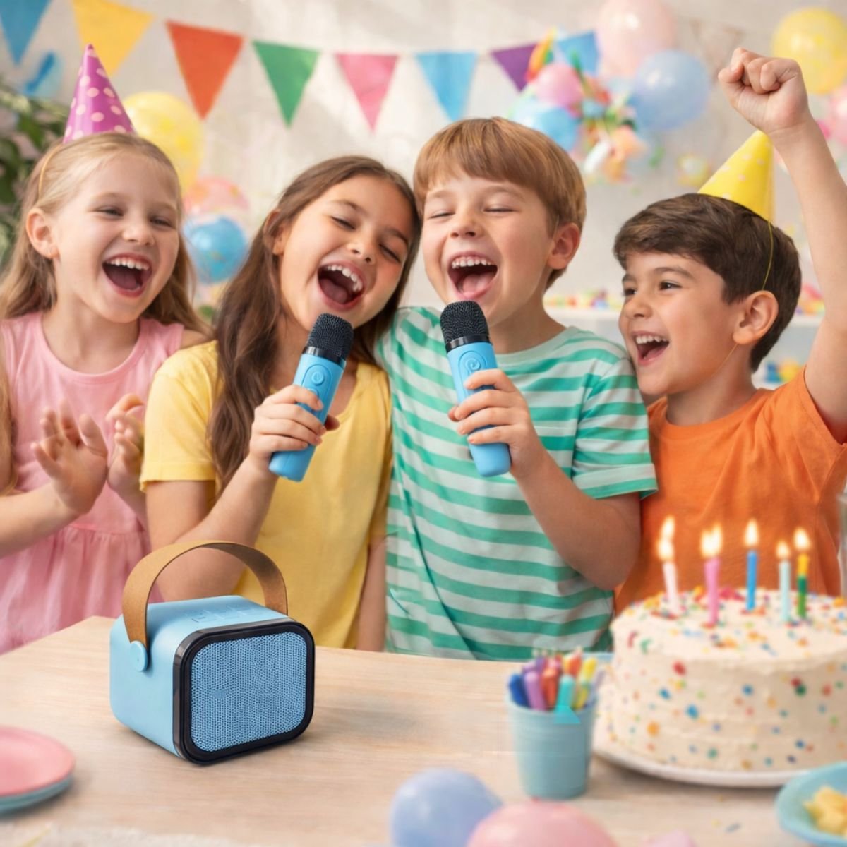 Home General Φορητό Πολύχρωμο Σύστημα Καραόκε με 2 Ασύρματα Μικρόφωνα & Καθαρό Ήχο