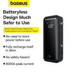 - Ready for extreme conditions Baseus Super Energy Mega Car internal chip ensures high performance even in extreme weather conditions. This means that the jump starter can work in temperatures from -40°C to 70°C without problem
