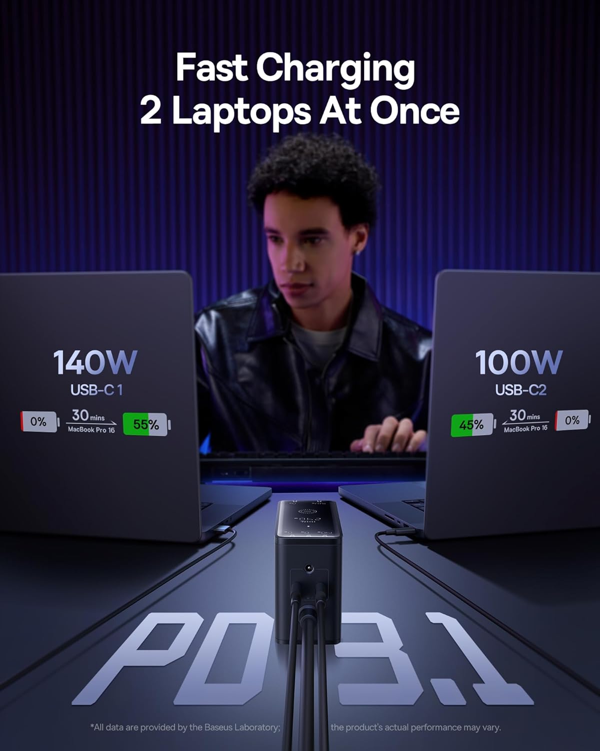 - Simultaneous Laptop Fast-Charging: Seamlessly charge 2 laptops at the same time with a PD3.1 maximum power of 140W for one laptop and a PD3.0 maximum power of 100W for the other.