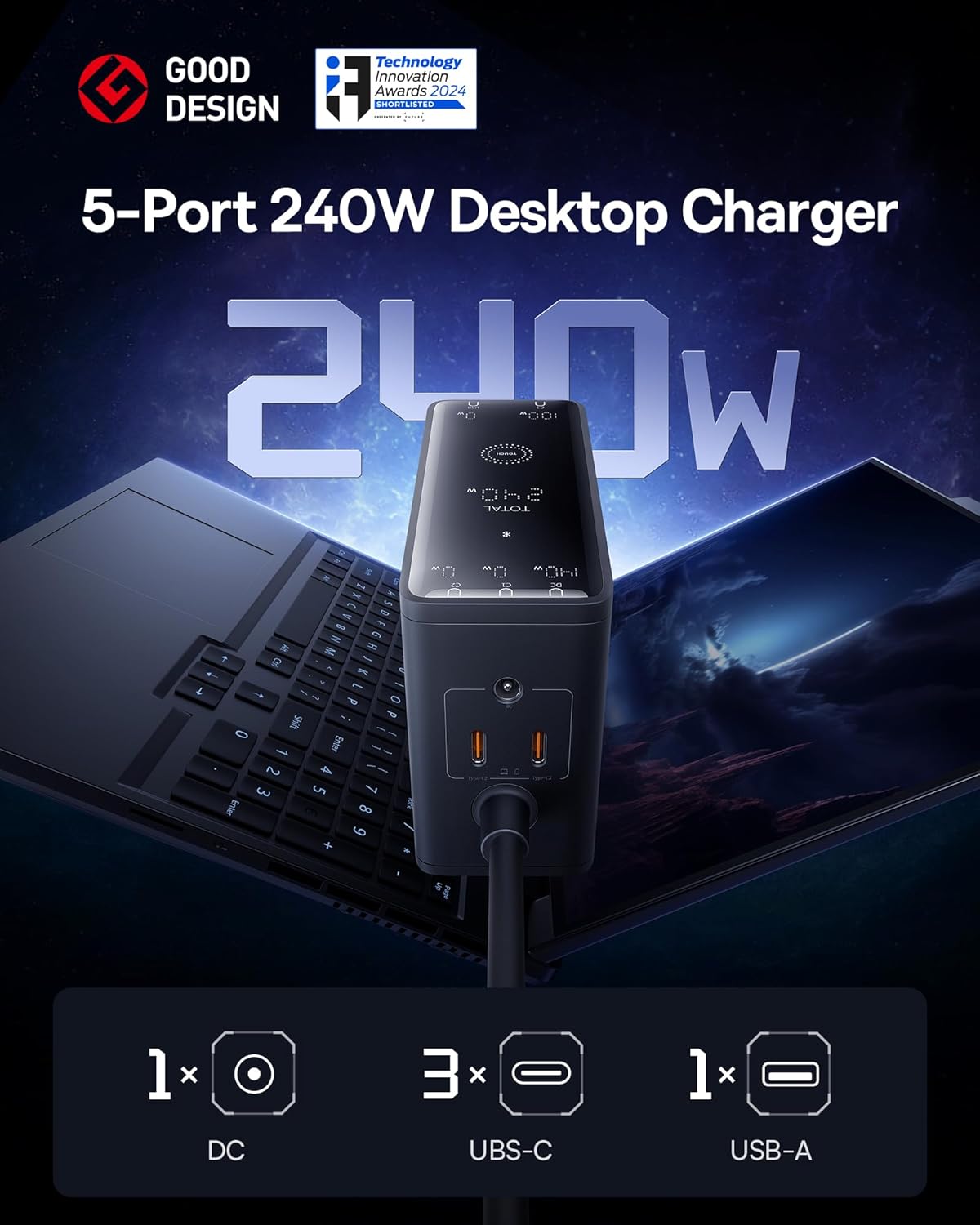 - Compact, 5-Port 240W Desktop Charger: Elevate your workspace with the industry's first 40% smaller charger to combine both round and square tipped AC adapters with USB-C adapters.