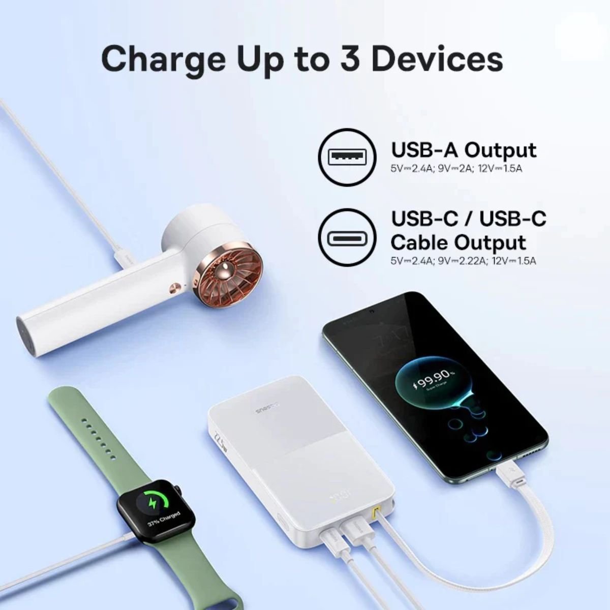 • Φόρτιση 3 συσκευών ταυτόχρονα μέσω του ενσωματωμένου καλωδίου USB C, της θύρας USB C και της θύρας USB A.
