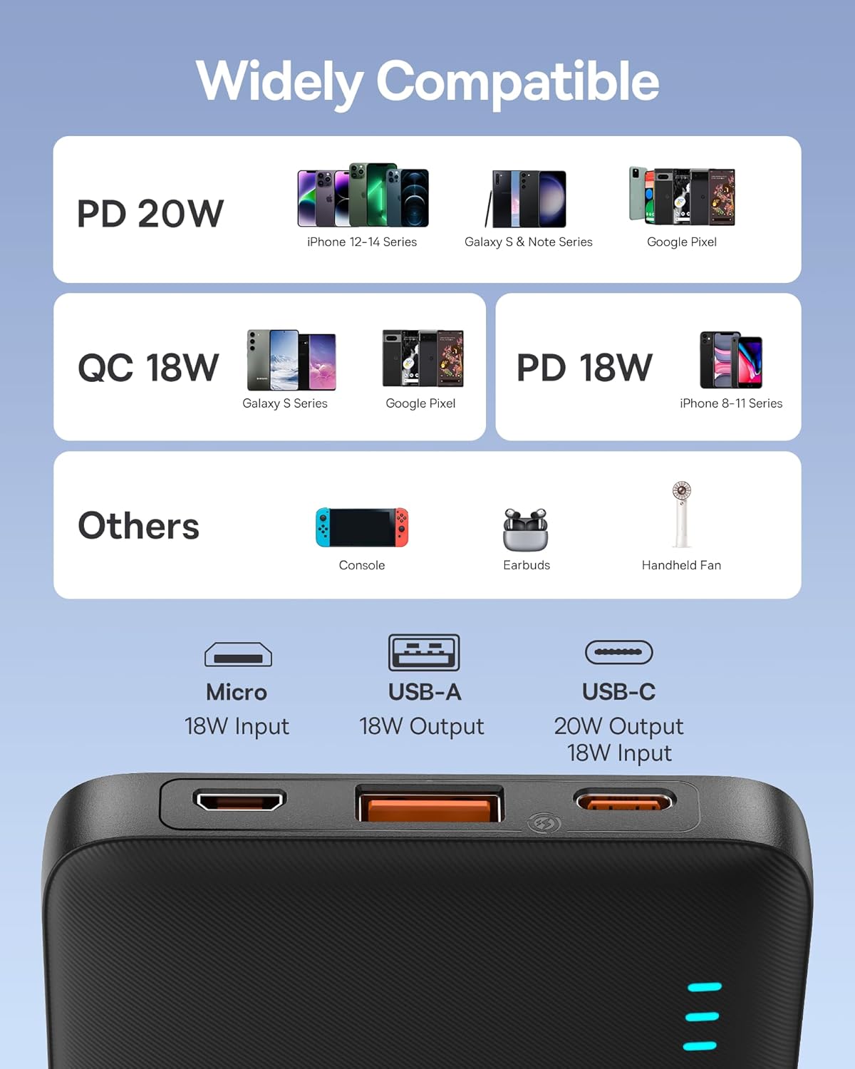 • Ultra-thin and Portable Slim and compact design makes it the perfect portable power bank for travels, and easily fits into bags or backpacks, so you can stay powered for the journey.