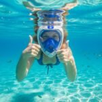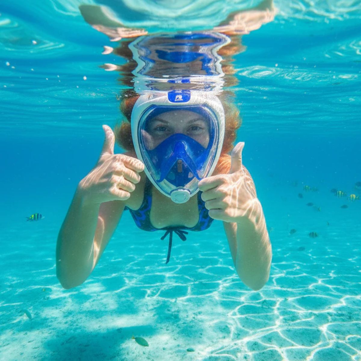The full face snorkeling mask offers a 180° panoramic view and comfortable breathing through both nose and mouth.