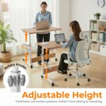 This table adopts E1 grade environmental protection particle board and base is made of high-strength carbon steel. The desktop angle is adjusted from 0° to 80° – reading, painting, writing and working to meet daily needs. The height adjustable mechanism operates with rotary knob for dynamic study or work. With four high quality wheels with brakes, it allows you relocate the table easily.