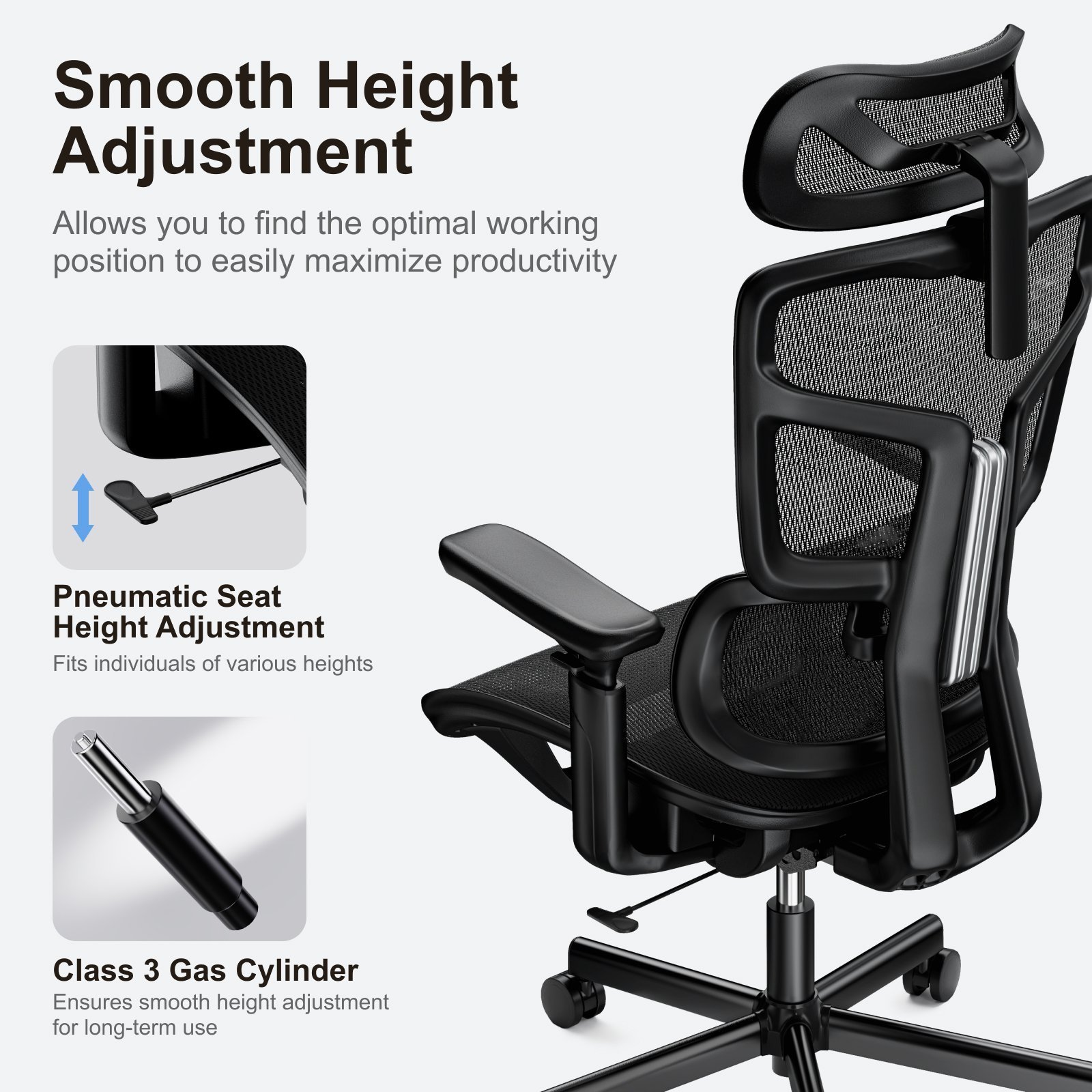 - Pneumatic Seat-Height Adjustment: quick and easy adjustment regulated height of chair relative to the floor