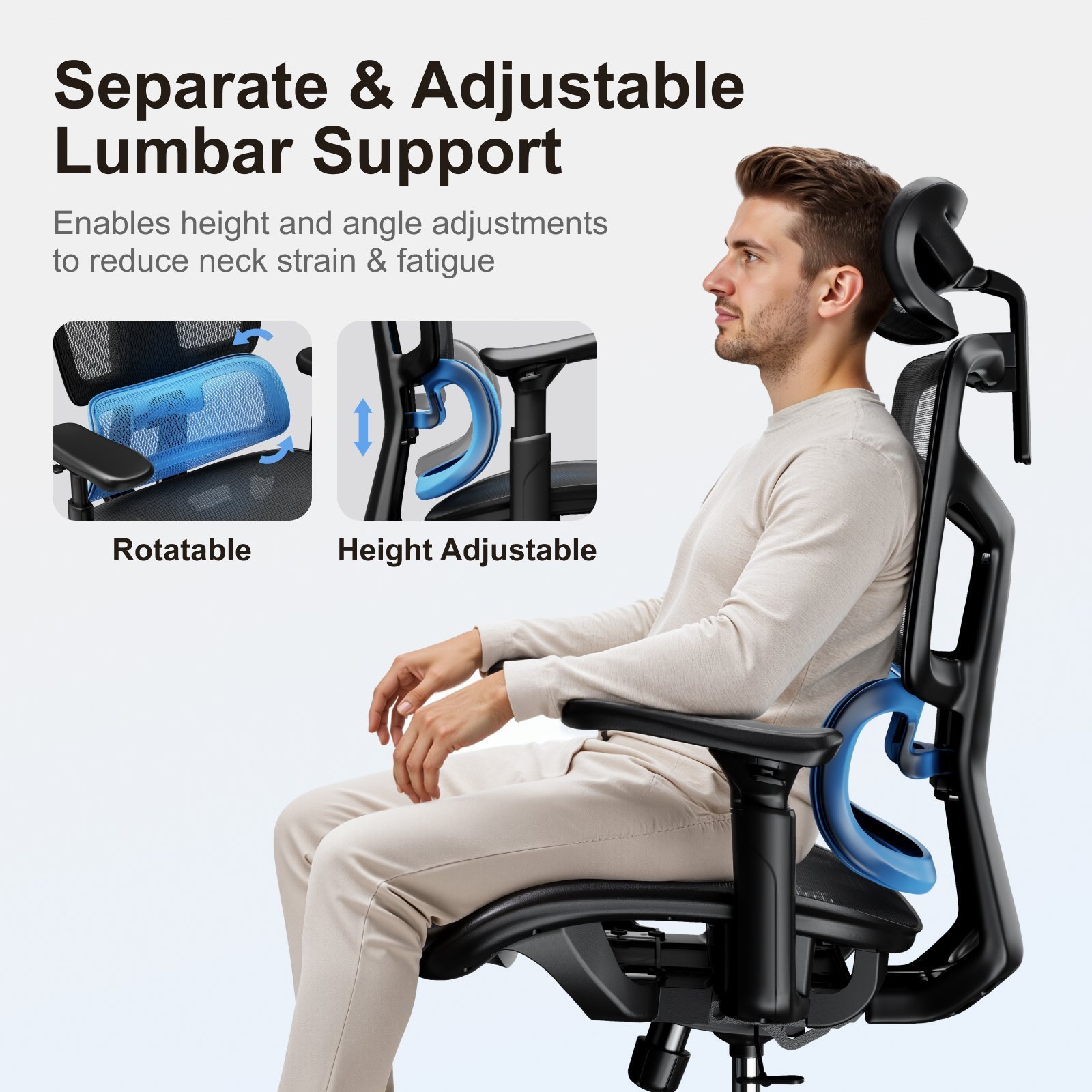 - Adjustable Lumbar Support: alleviates lower back pain during long periods of sitting