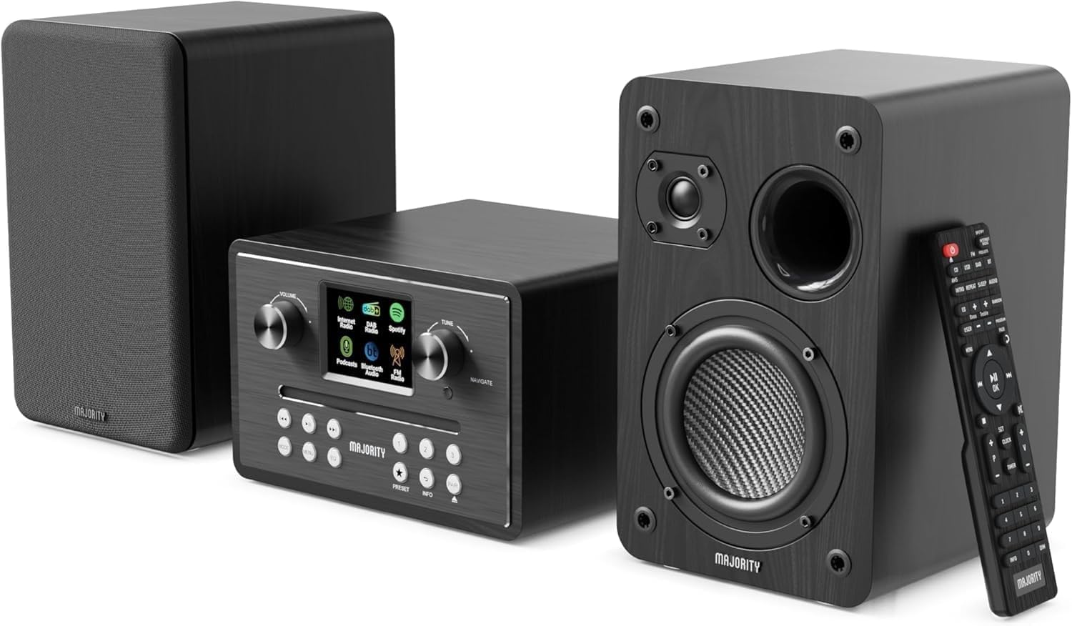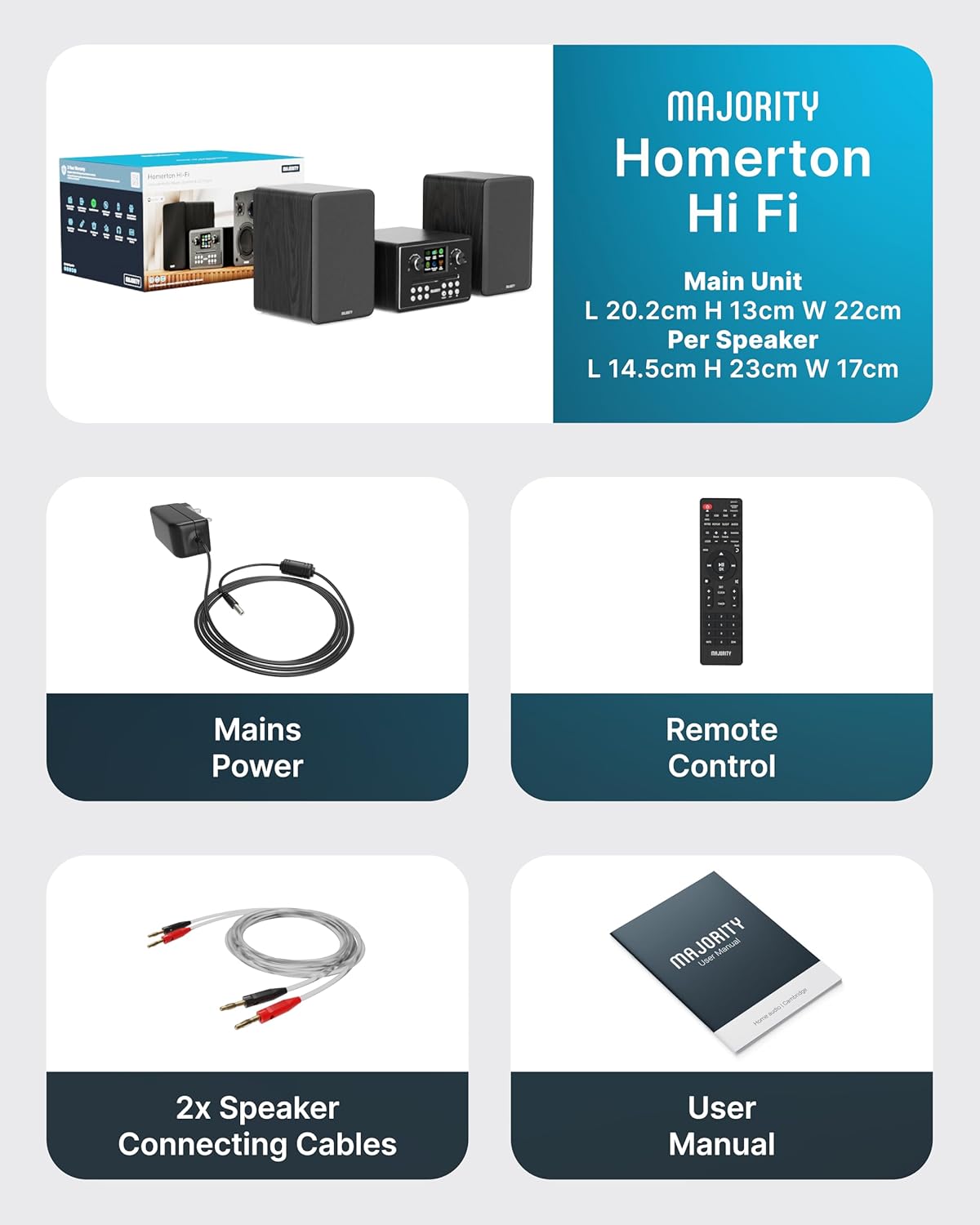 𝗪𝗛𝗔𝗧𝗦 𝗜𝗡 𝗧𝗛𝗘 𝗕𝗢𝗫: Majority Homerton HiFi main unit, 2x stereo speakers, 2x speaker connection cables, power adaptor, remote control, and user guide. Dimensions: Main Unit – 20.2 x 13 x 22cm, Speakers – 14.5 x 23 x 17cm each.