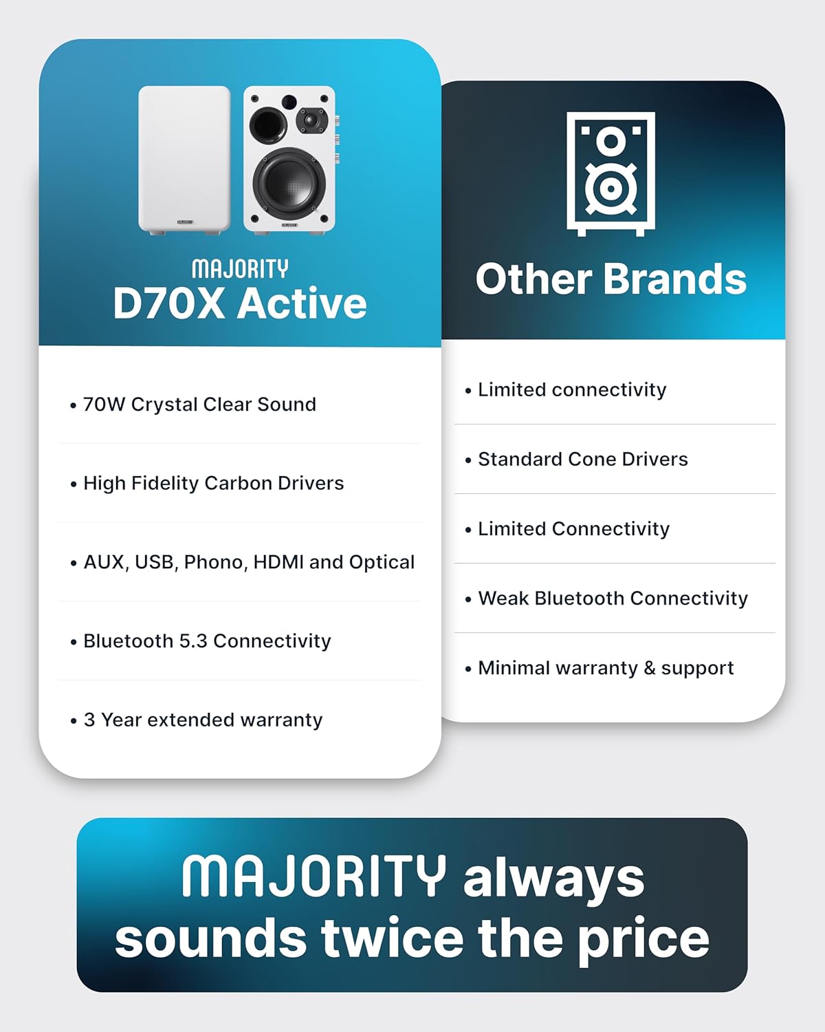 Majority Speakers Active D70X 70W 2.0 BT/USB/Phono/HDMI ARC Black (pair) €129,99