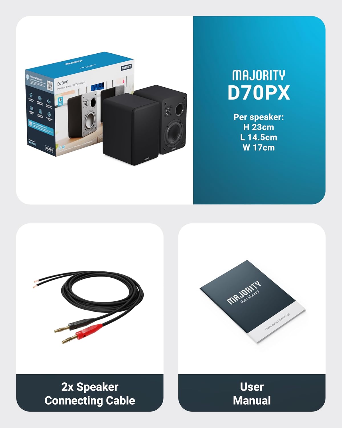 𝗪𝗛𝗔𝗧’𝗦 𝗜𝗡 𝗧𝗛𝗘 𝗕𝗢𝗫: This product includes 2 x Majority D70XPassive Speakers, 2 x 2-metre speaker cables (banana plug to stripped wire), and 1 x User Manual. Each speaker measures 14.5 cm (W) x 17.cm (D) x 23 cm (H) and weighs 3.6 kg.