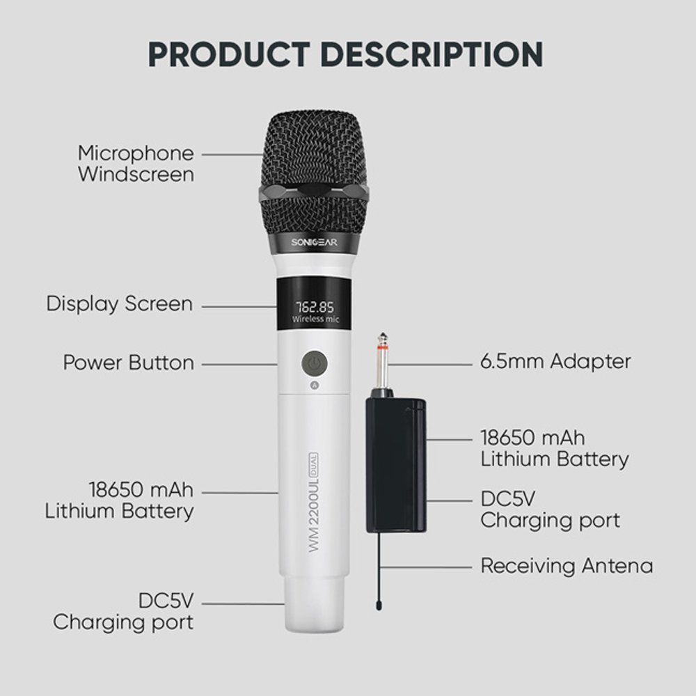 The SonicGear WM 2200UL DUAL is a dual wireless microphone system with a 50m working distance, 7-8 hour battery life, and a frequency response of 20Hz-20KHz. Both the microphones and the receiver use rechargeable 18650 lithium-ion batteries, and the receiver connects via a 6.3mm jack. The system uses an automatic frequency alignment modulation method and has an audio output of 0-300mV