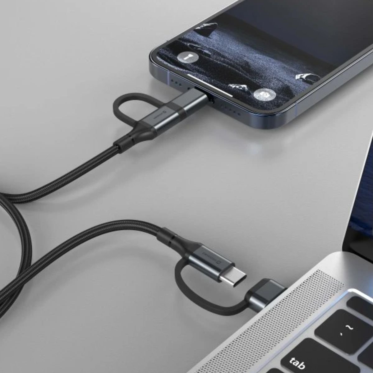 Πολυχρηστικό braided καλώδιο 4in1 για φόρτιση και μεταφορά δεδομένων, ιδανικό για πολλές συσκευές με ένα μόνο καλώδιο.