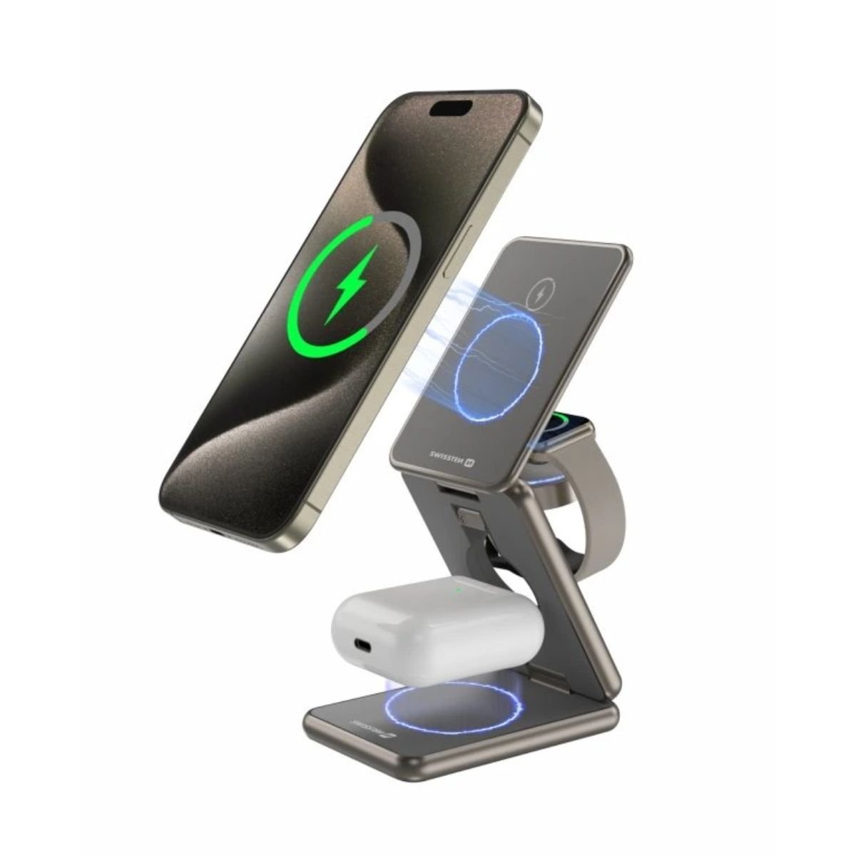 Swissten AL1 Ασύρματος Φορτιστής Αλουμινίου 3-σε-1 Αναδιπλούμενος 23W (Συμβατός με MagSafe) 22055550 Γκρί