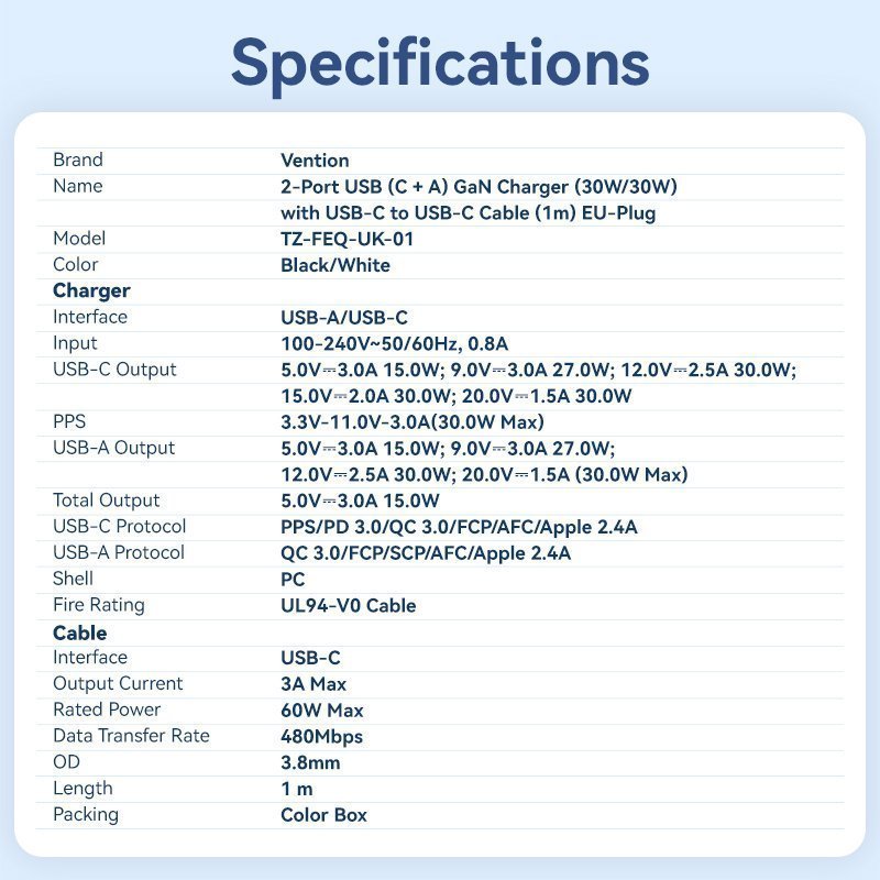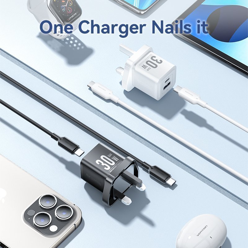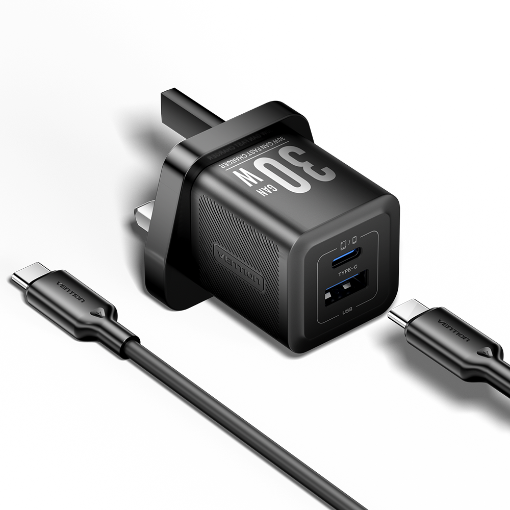 Vention Charger Wall GaN 30W 1xA 1xC+USBC Cable Black TZ-FEQB0-UK-01
