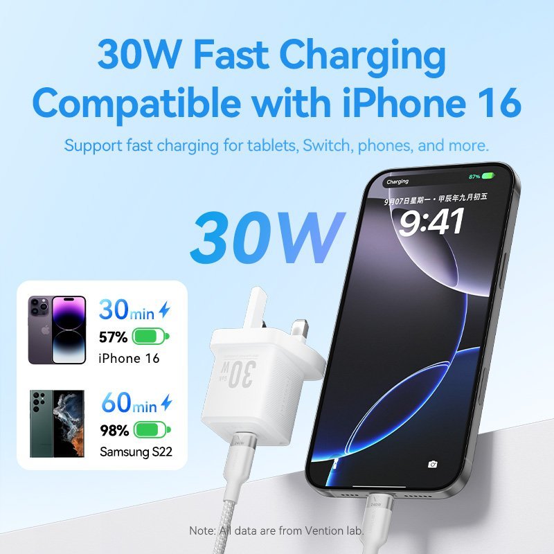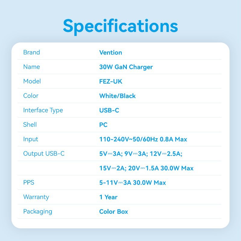 The Vention GaN 30W Wall Charger (FEZB0-UK) is a compact, high-efficiency power adapter designed for the UK market. By using Gallium Nitride (GaN) technology, it offers significant power output in a "mini" form factor that stays cooler than traditional silicon chargers