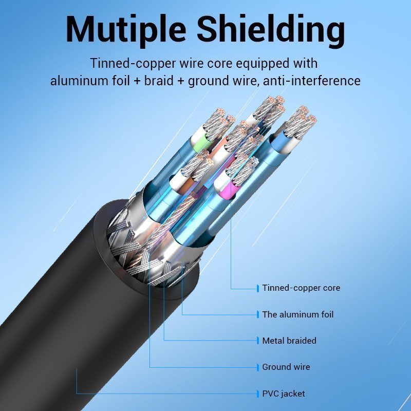 - Superior Shielding for Interference-Free Transmission: The cable is meticulously engineered with a tinned copper wire core, encased in a robust layer of aluminum foil, braided shielding, and a ground wire. This meticulous construction effectively minimizes interference from external sources, ensuring a pristine signal transmission for a flawless visual experience.